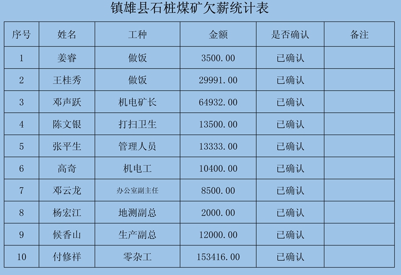 2、本次登記情況:經(jīng)初核確認(rèn),累計(jì)共收到12條欠薪申報(bào),涉及12人1595830元;煤礦方已簽字蓋章確認(rèn)8條,涉及8人413830元。
