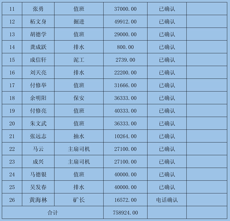2、本次確認(rèn)情況:經(jīng)初核確認(rèn),累計(jì)共收到25條欠薪證據(jù),涉及25人742352元;勞資雙方已簽字蓋章確認(rèn)25條欠薪證據(jù);經(jīng)法人陽建華電話確認(rèn)1人16572元。煤礦方提供確認(rèn)名冊一份,其他50名欠薪人員存在以下說明:3名人員證據(jù)不足無法確認(rèn)、10名(兩個工隊(duì))待法院判決后再確認(rèn)、16名人員欠薪已支付、21名人員由于證據(jù)不足無法確認(rèn)。