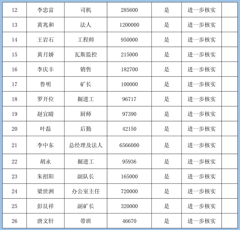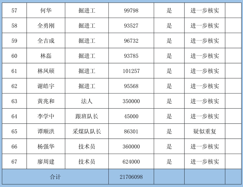 3、其他情況:煤礦方簽字認(rèn)可的216條欠薪申報(bào),均持有煤礦方開出的工資欠條(蓋章)或是法院判決書等相關(guān)依據(jù),實(shí)際用工情況無法核實(shí)。