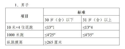 資格審核合格的人員進(jìn)入體能測(cè)試,體能測(cè)試按照公安部《關(guān)于印發(fā)公安機(jī)關(guān)錄用人民警察體能測(cè)評(píng)項(xiàng)目和標(biāo)準(zhǔn)(暫行)的通知》及其所附標(biāo)準(zhǔn)開(kāi)展。體能測(cè)試的項(xiàng)目如下: