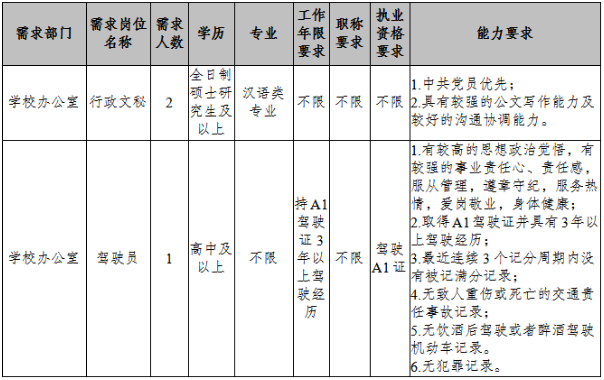 為適應(yīng)學(xué)校發(fā)展的需要,需面向社會誠聘2名行政人員及1名駕駛員,現(xiàn)將有關(guān)事項公告如下: