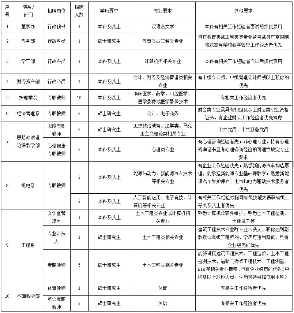 50周歲以下,本科及以上學(xué)歷,中級(jí)及以上職稱,計(jì)算機(jī)、人工智能、汽修、信息管理、旅游管理、烹飪與營(yíng)養(yǎng)、醫(yī)學(xué)類、教育管理等專業(yè)或相近專業(yè)教育背景,本崗位工作經(jīng)歷超過3年以上;有對(duì)應(yīng)相關(guān)專業(yè)的教學(xué)科研工作經(jīng)歷;對(duì)專業(yè)(群)建設(shè)具有戰(zhàn)略性構(gòu)想和創(chuàng)新性思維;有帶領(lǐng)教師團(tuán)隊(duì)建設(shè)一流專業(yè)的能力;持副高級(jí)以上職稱、碩士研究生與博士研究生優(yōu)先聘用。(博士、教授,男放寬至60周歲以下,女放寬至55周歲以下)。