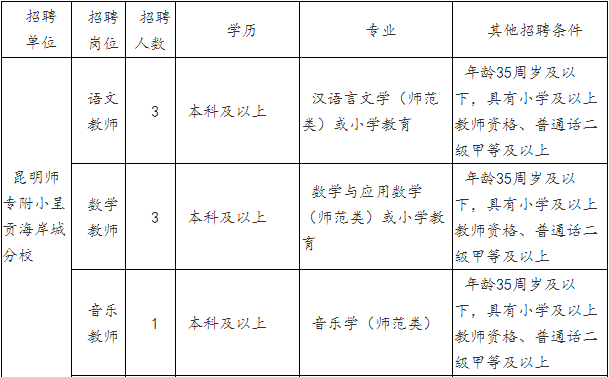 呈貢分校2019年招聘教師均為民辦教師(無公辦編制),教師工資不低于公辦學校教師水平。具體招聘崗位如下: