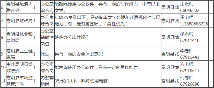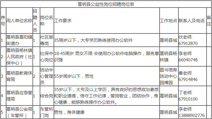 招聘具體事宜請咨詢用人單位,符合公益性崗位上崗條件的個人也可以到嵩明縣勞動就業(yè)服務(wù)局綜合科申請公益性崗位求職登記,詳詢陳老師:0871-67917444。