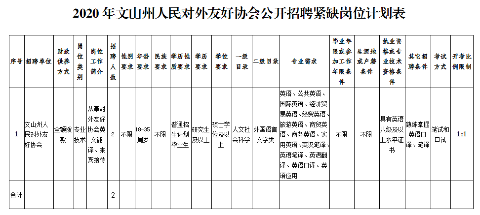 本次招聘崗位為文山州人民對(duì)外友好協(xié)會(huì)英語(yǔ)翻譯,招聘人數(shù)2人,負(fù)責(zé)友好協(xié)會(huì)具體工作,兼顧外事工作,具體崗位、人數(shù)、資格條件等詳見(jiàn)下表。