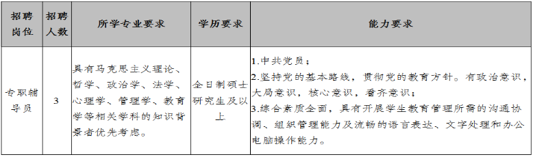 為適應(yīng)學(xué)校發(fā)展的需要,需面向社會誠聘3名專職輔導(dǎo)員,現(xiàn)將有關(guān)事項公告如下: