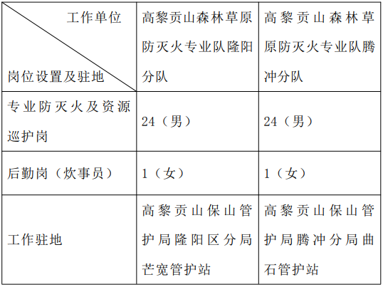 現(xiàn)因工作需要,云南騰森人力資源服務(wù)有限責(zé)任公司面向社會公開招聘高黎貢山森林草原專業(yè)防滅火隊(duì)員,派遣到高黎貢山自然保護(hù)區(qū)保山管護(hù)局森林草原防滅火專業(yè)隊(duì)工作,現(xiàn)將招聘事宜公告如下: